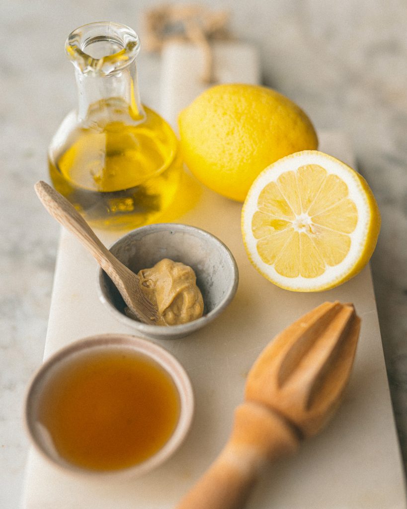 - Versa tutti gli ingredienti in un barattolo con chiusura ermetica: olio extravergine, senape, miele (o sciroppo d’acero), succo di limone e sale.